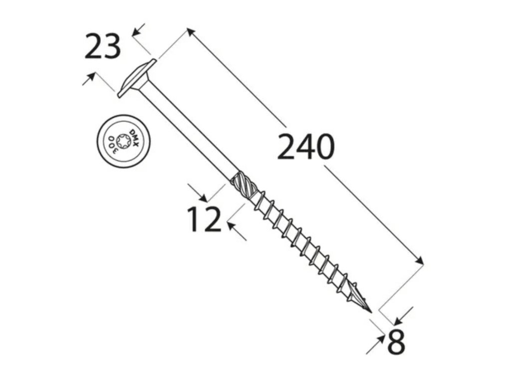 - Šetrnosť k konštrukcii Napriek svojej dĺžke a hrúbke vrut neničí drevo. Rezná špička spoľahlivo prereže vlákna, takže aj pri montáži blízko okrajov trámov nehrozí ich rozštiepenie.
